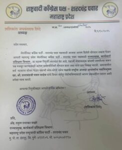 या पत्रात शशिकांत शिंदे यांनी म्हटले आहे की, “पक्ष संघटन मजबूत करण्यासाठी व कार्यकर्त्यांना प्रशिक्षण देण्यासाठी आपण दिलेले योगदान लक्षात घेऊन ही जबाबदारी सोपवण्यात येत आहे. पक्षाचे विचार आणि श्री. शरदचंद्रजी पवार साहेबांचे धोरण सर्वसामान्यांपर्यंत पोहोचविण्यासाठी आपण प्रयत्नशील राहाल अशी अपेक्षा आहे.”